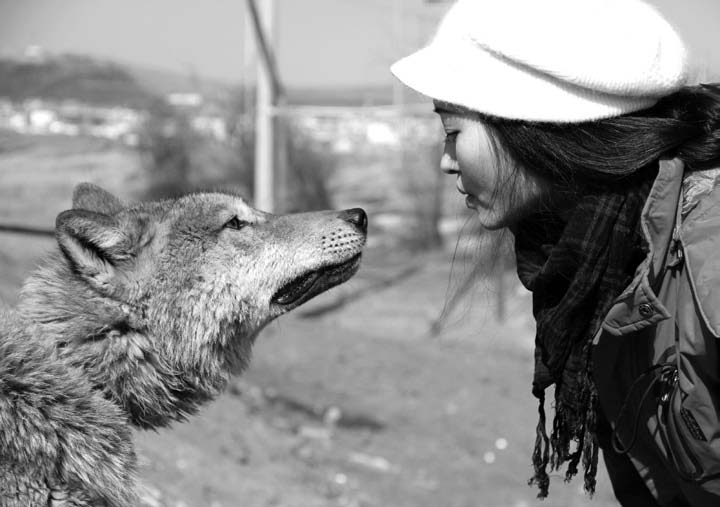 他没见过肉?!我哪敢再伸手,忙捡了一根木棍把肉挑过去。狼一口咬断木棍,像驱逐了一个竞争对手。他快速抢过肉叼到墙角,用爪子护住,龇牙环顾,低声咆哮着警告周围的竞争者。直到我们缓缓退到让他安心的距离,狼才收起了凶相,挪开狼爪,舔掉肉上的泥土,深深嗅闻着,像审视至宝。他平息气喘,迸出两声沙哑的咳嗽,埋头把脖子上的项圈略微抖松一点。他并没有立刻狼吞虎咽,反而看着眼前的肉发呆。好一会儿他虔诚地闭上了眼睛,侧头趴下上半身,用脖子在肉上摩挲着,打个滚,起身抖抖毛,换另一侧身子,再滚……