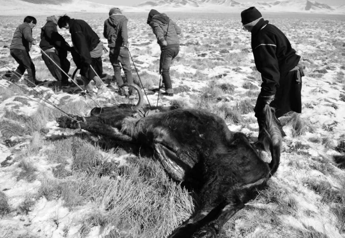 这头死牦牛囫囵个儿时估计有一吨重,十来个人拖不动它。于是牧民将死牛开膛破肚,丢弃了所有内脏和草包,减轻了三分之一的重量,只留肉壳。又把绳索分别拴在牦牛四条腿和犄角上,每个人背负一股绳索像拉纤一样喊着号子共同使力,总算能拖动死牛了。已经封冻的沼泽地坑坑包包,车开不进来,牛角牛蹄又经常钩挂在草垛土堆里,十二个人深一脚浅一脚,拖行起来举步维艰,拖三两米就得歇一次,百米的距离拖了一个多小时。亦风累得嘴唇发紫,不停地吸哮喘药,泽仁和我大汗淋漓,缺氧乏力。