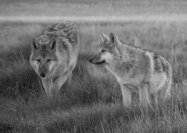 两只狼一前一后翻山走来,边走边抖擞狼毛,似乎是刚在哪个草窝子里睡足了觉,太阳落山该是他们出猎的时间了。