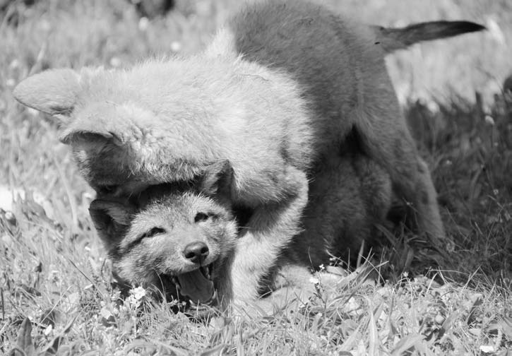 我知道如果我伸手摸他们,他们多半会走开,于是我会把手撑在地上,悄悄爬动手指一点点向他们凑近,停放在小狼身后或者人狼之间,这样,小家伙们松弛的尾巴或爪子就会无意中搭在我的手背上。相比起紧抱着慌张防备的小狼,这种不经意的触碰更令我情动。