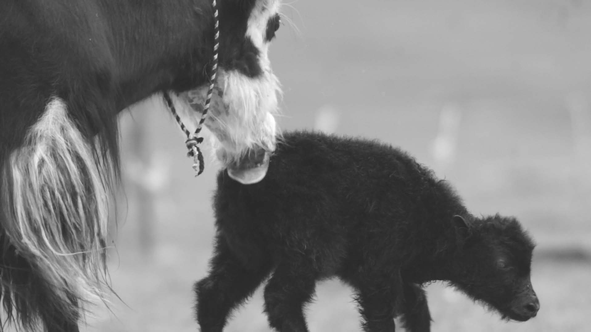 我下山去探望这摇摇晃晃的小东西时,他撇着外八字的腿,羞怯地拱到牛妈妈肚子下面,顶着母牛硕大的乳房夹住自己的脑袋来平衡身体。雨后瓦蓝的天空、母牛舔他额角的舌头,还有他长长的睫毛倒映在小牛犊清亮的黑眼珠上,这是牦牦雨眼中的世界。