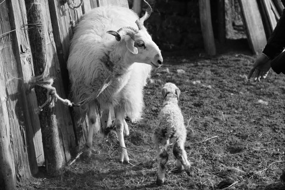尽管我喜欢小羊羔,可是越爱小羊就越恨大羊。别地儿的羊我不清楚,但是这个草原上的羊一个比一个自私。究其根源,牛羊太多了,草太薄了,羊口众多连温饱都成问题,多一只小羊多一个包袱,在匮乏的食物面前,连哺乳的母性本能都会退化,每年都有不少母羊遗弃羊羔。帮小羊找亲妈,强迫母羊喂奶是接羔期间牧民最头疼的事儿。我经常看见牧民把羊羔拴在母羊的后腿上,还得把母羊也拴在羊圈附近,免得母羊把羔子拖进泥浆里淹死。即便强迫捆在一起,牧民抓住母羊奶头往小羊嘴里塞,母羊还是避来躲去拒不喂奶。虚弱的羊羔在母羊身下饿得吐舌头,无论怎么哀叫跪求,亲妈都无动于衷,直到小羊饿死乳下。今年初春,我们拍到泽仁家有一只母羊更恶劣,为了早点解放去吃春草,干脆把小羊羔乱蹄踩死,然后朝人咩叫着,似乎不耐烦地抱怨:“他死了,这下总可以把我放了吧。”主人解开羊绳的时候,忍不住狠狠扇了她一耳光。