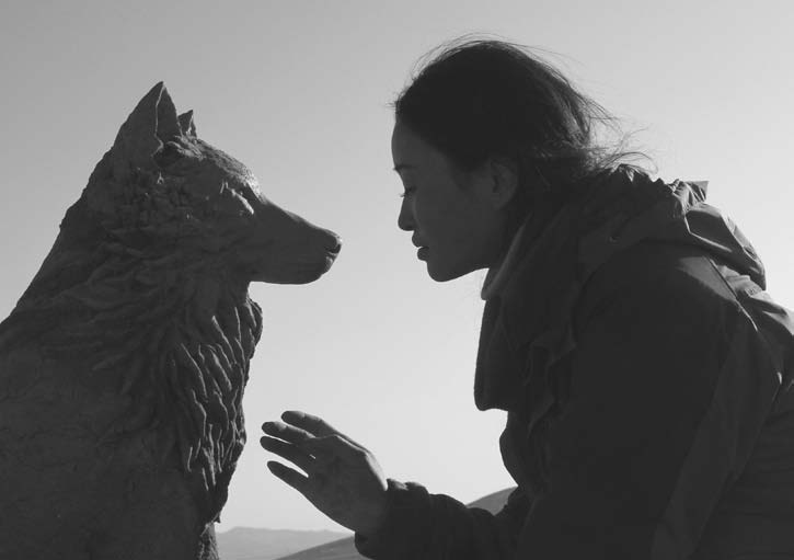 辣妈绕着孩子的雕塑前看后看,或许雕塑被烧硬了让她有些意外,她从“双截棍”的头顶闻到尾巴,伸爪子摸摸他的脸,鼻子碰鼻子,还顺着“双截棍”的目光张望他在看什么。辣妈出了一会儿神,转身人立起来,前爪撑在狼雕肩上,轻轻咬了咬“双截棍”的耳朵。