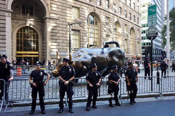 一平方英里之内——也正是荷属新阿姆斯特丹的市区——就是建国至今的金融区:华尔街,纽约证券交易所,世贸中心,全国跨国银行,投资、信托、保险公司,联邦储备,还有那个现在成为过街老鼠的AIG……也就是说,这里就是纽约、美国、世界的金融中心,牛市即从这里开始牛。只不过,在全球经济给搞得如此惨痛的今天,那头大铜牛也不再像是牛市那头猛牛了,简直变成了牛魔王。