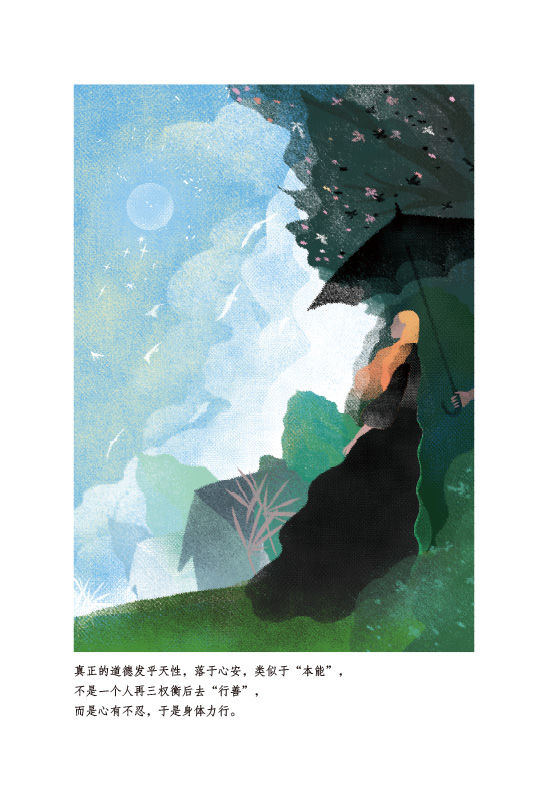 真正的道德发乎天性,落于心安,类似于“本能”,不是一个人再三权衡后去“行善”,而是心有不忍,于是身体力行。因此,对人进行道德教化不能通过诱之以利或者以权威相迫的方式,这只会教出更多阳奉阴违、表里不一的伪善之徒;同样,对自我的道德修养也不能靠自我压抑来达成,那只会演变成一场自己对自己的暴力镇压,结果只能是在意识层面上制造更深的自我分裂。