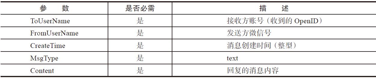 公众号回复的文本消息的参数及描述如表4-7所示。