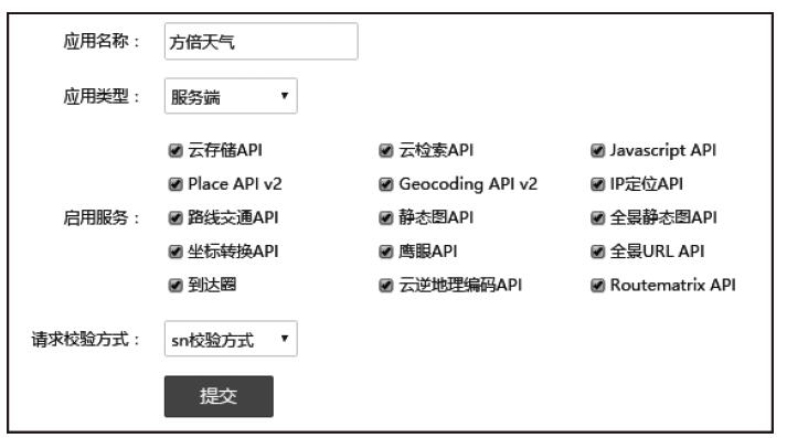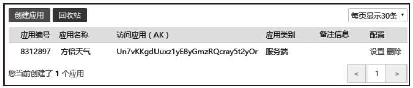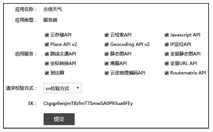 “应用名称”可以随便填写,“应用类型”选择“服务端”,“启用服务”里面的选项可以全部选择,“请求校验方式”选择“sn校验方式”,然后点击“提交”按钮,回到控制台。在页面上可以看到AK参数的值,如图4-18所示。