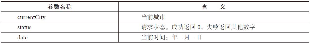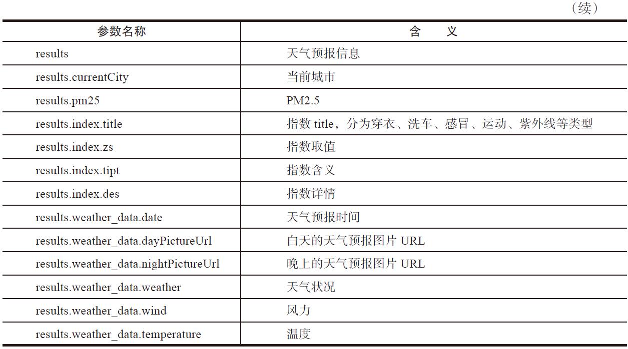 { "error":0, "status":"success", "date":"2016-06-29", "results":[ { "currentCity":"深圳", "pm25":"18", "index":[ { "title":"穿衣", "zs":"炎热", "tipt":"穿衣指数", "des":"天气炎热,建议着短衫、短裙、短裤、薄型T恤衫等清凉夏季服装。" }, { "title":"洗车", "zs":"不宜", "tipt":"洗车指数", "des":"不宜洗车,未来24小时内有雨,如果在此期间洗车,雨水和路上的泥水 可能会再次弄脏您的爱车。" }, { "title":"旅游", "zs":"一般", "tipt":"旅游指数", "des":"天气较热,有微风,但较强降雨的天气将给您的出行带来很多的不便,若 坚持旅行建议带上雨具。" }, { "title":"感冒", "zs":"少发", "tipt":"感冒指数", "des":"各项气象条件适宜,发生感冒概率较低。但请避免长期处于空调房间中,以 防感冒。" }, { "title":"运动", "zs":"较不宜", "tipt":"运动指数", "des":"有较强降水,建议您选择在室内进行健身休闲运动。" }, { "title":"紫外线强度", "zs":"弱", "tipt":"紫外线强度指数", "des":"紫外线强度较弱,建议出门前涂擦SPF在12-15之间、PA+的防晒护肤品。" } ], "weather_data":[ { "date":"周三 06月29日 (实时:31℃)", "dayPictureUrl":"http:// api.map.baidu.com/images/weather/day/ zhongyu.png", "nightPictureUrl":"http:// api.map.baidu.com/images/weather/night/ zhongyu.png", "weather":"中雨", "wind":"微风", "temperature":"33 ~ 27℃" }, { "date":"周四", "dayPictureUrl":"http:// api.map.baidu.com/images/weather/day/dayu. png", "nightPictureUrl":"http:// api.map.baidu.com/images/weather/night/ dayu.png", "weather":"中到大雨", "wind":"微风", "temperature":"32 ~ 26℃" }, { "date":"周五", "dayPictureUrl":"http:// api.map.baidu.com/images/weather/day/ dayu.png", "nightPictureUrl":"http:// api.map.baidu.com/images/weather/night/ dayu.png", "weather":"中到大雨", "wind":"微风", "temperature":"30 ~ 26℃" }, { "date":"周六", "dayPictureUrl":"http:// api.map.baidu.com/images/weather/day/ zhenyu.png", "nightPictureUrl":"http:// api.map.baidu.com/images/weather/night/ zhenyu.png", "weather":"阵雨", "wind":"微风", "temperature":"32 ~ 26℃" } ] } ] }