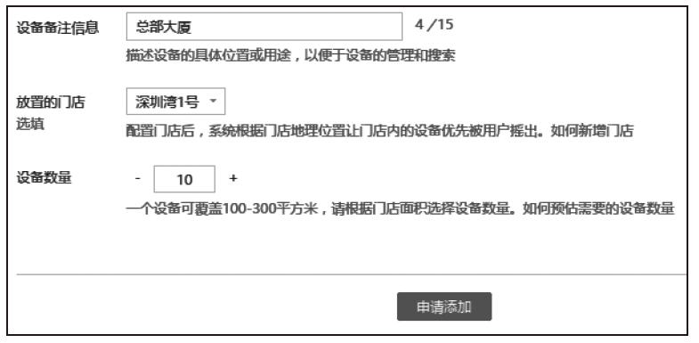 登录微信公众平台后台,依次进入“功能”|“摇一摇周边”|“设备管理”,然后点击“添加设备”按钮。在页面中输入“设备备注信息”,选择“放置的门店”以及“设备数量”,如图19-2所示。