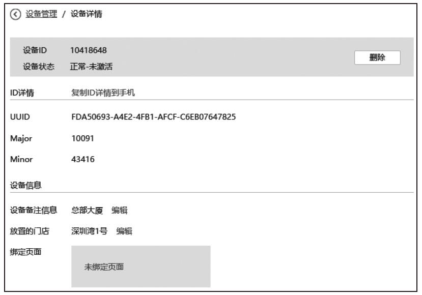 点击“详情”链接,可以看到该设备ID的详情,包括UUID、Major、Minor等3个参数,如图19-4所示。后面进行设备配置时,将需要用到这3个参数。