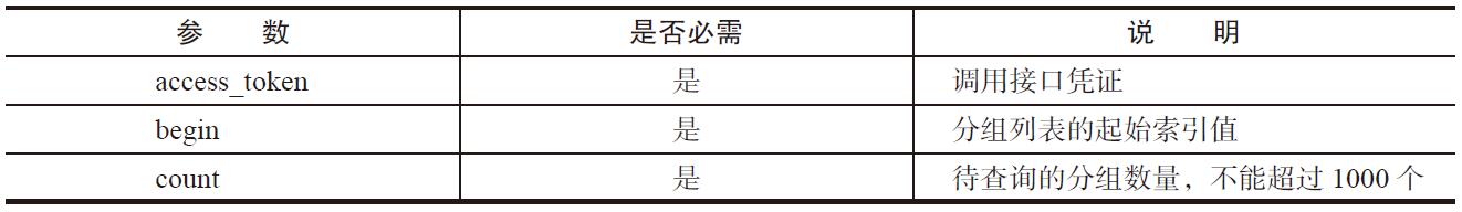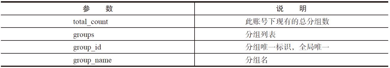 { "data":{ "total_count":100, "groups":[ { "group_id":123, "group_name":"test1" }, { "group_id":124, "group_name":"test2" } ] }, "errcode":0, "errmsg":"success." }