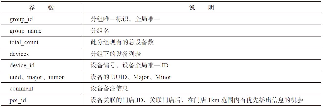 { "data":{ "group_id":123, "group_name":"test", "total_count":100, "devices":[ { "device_id":123456, "uuid":"FDA50693-A4E2-4FB1-AFCF-C6EB07647825", "major":10001, "minor":10001, "comment":"test device1", "poi_id":12345 }, { "device_id":123457, "uuid":"FDA50693-A4E2-4FB1-AFCF-C6EB07647825", "major":10001, "minor":10002, "comment":"test device2", "poi_id":12345 } ] }, "errcode":0, "errmsg":"success." }
