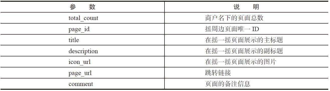 { "data":{ "pages":[ { "comment":"520中国微信会议", "description":"2016微信开发", "icon_url":"http:// p.qpic.cn/ecc_merchant/0/w_pic_1479985234871/0", "page_id":3089022, "page_url":"http:// www.doucube.com/wxshake/jumpHongbao.html", "title":"微信会议" }, { "comment":"自定义链接", "description":"自定义链接", "icon_url":"http:// mmbiz.qpic.cn/mmbiz_jpg/BIvw3ibibwAYN3C2Yz4hib6I9o0f RxoMiblflXN06gmZu86jGa0aNtehVlibib6bBzhabiaySxIZaI2Obiab6GyFguRQkA/ 0?wx_fmt=jpeg", "page_id":5374944, "page_url":"http:// www.doucube.com/wxshake/AddContact.html", "title":"微信摇一摇" }, { "comment":"卡券发放100MB流量券", "description":"方倍工作室", "icon_url":"https:// o2o.gtimg.com/ibeacon/img/coupon-logo.jpg", "page_id":585404, "page_url":"http:// zb.weixin.qq.com/nearbycgi/html/card/card.html?wechat_ card_js=1", "title":"卡券发放" }, { "comment":"", "description":"方倍工作室", "icon_url":"https:// o2o.gtimg.com/ibeacon/img/store-logo.png", "page_id":5377792, "page_url":"https:// zb.weixin.qq.com/app/template/store.html", "title":"摇一摇有惊喜" }, { "comment":"摇红包模板测试", "description":"吃粽子划龙舟", "icon_url":"http:// www.doucube.com/redpacket/120x120.jpg", "page_id":3195194, "page_url":"http:// zb.weixin.qq.com/app/shakehb/hongbaotpl.html#wechat_ redirect", "title":"清明节" }, { "comment":"系统自动生成", "description":"方倍资讯", "icon_url":"http:// mmbiz.qpic.cn/mmbiz_png/BIvw3ibibwAYPuibQ37g8KIWj 3hGdrH3e97Uj45NRG4Z9cqTiaYT1YgibofmpFPA5CX5SGhDpLZ3180uOI1YWDpTl0 Q/0?wx_fmt=png", "page_id":5372401, "page_url":"https:// zb.weixin.qq.com/app/template/defaultStore.html", "title":"发现周边门店" }, { "comment":"", "description":"赢取超值优惠", "icon_url":"https:// o2o.gtimg.com/ibeacon/img/supermarket_logo.png", "page_id":5310884, "page_url":"https:// wxo2o.qq.com/ibeacon/beaconweb/html/draw/lottery. html#wechat_redirect", "title":"礼从天降" } ], "total_count":7 }, "errcode":0, "errmsg":"success." }