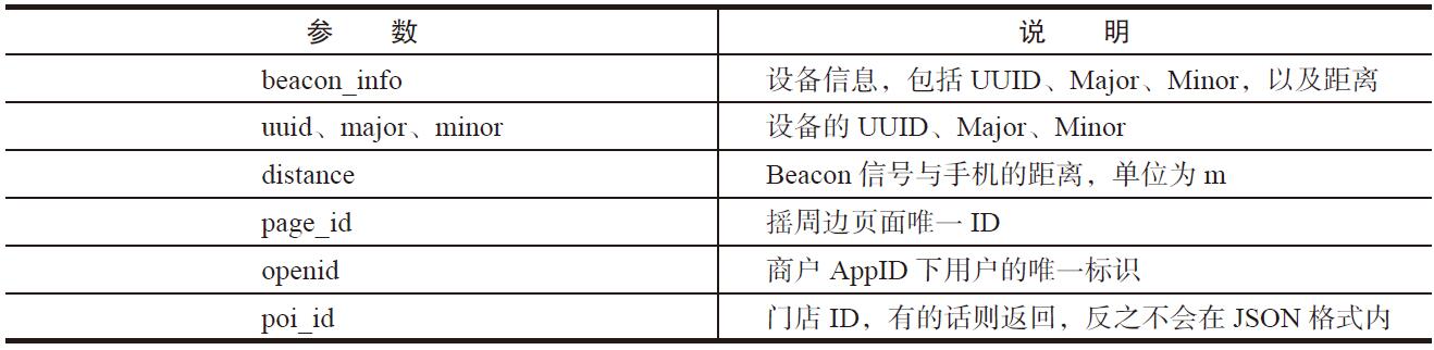 { "data":{ "page_id ":14211, "beacon_info":{ "distance":55.00620700469034, "major":10001, "minor":19007, "uuid":"FDA50693-A4E2-4FB1-AFCF-C6EB07647825" }, "openid":"oVDmXjp7y8aG2AlBuRpMZTb1-cmA", " poi_id":1234 }, "errcode":0, "errmsg":"success." }