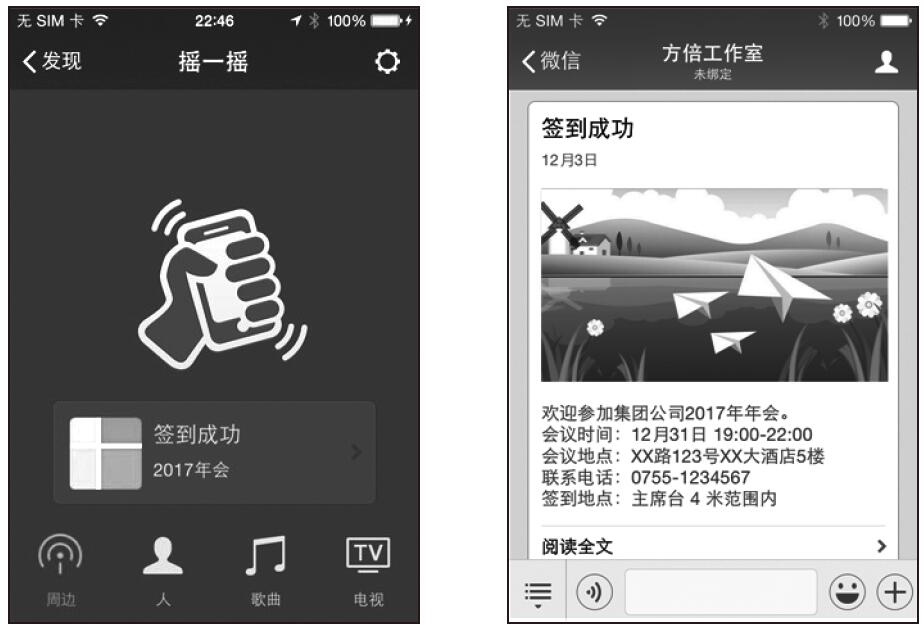 最终用户摇到的签到页面及收到的图文消息如图19-27所示。