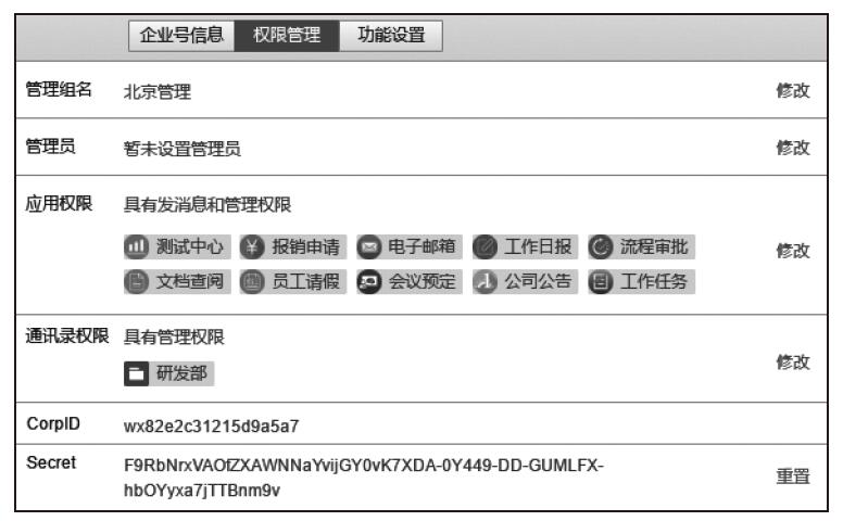 20.1.3 管理组 04-13Ctrl+D 收藏本站 关灯 护眼 小 中 大 繁 直达底部 对应用的控制需要使用管理组来完成。登录企业号后台,依次进入“设置”|“权限管理”,在“普通管理组”中新建一个管理组,填写好管理组的名称,设置好级别、通讯录权限及应用权限之后,就可以看到应用的详情了,其中包括CorpID和Secret,如图20-3所示。 图20-3 管理组 上一章:上一章 下一章:下一章