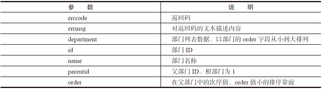 { "errcode":0, "errmsg":"ok", "department":[ { "id":2, "name":"广州研发中心", "parentid":1, "order":10 }, { "id":3, "name":"邮箱产品部", "parentid":2, "order":40 } ] }