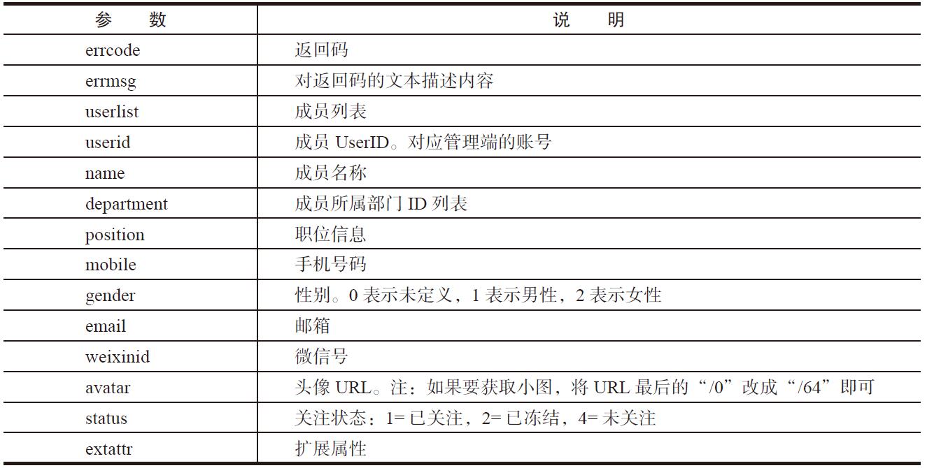 { "errcode":0, "errmsg":"ok", "userlist":[ { "userid":"zhangsan", "name":"李四", "department":[1,2 ], "position":"后台工程师", "mobile":"15913215421", "gender":"1", "email":"[email protected]", "weixinid":"lisifordev", "avatar":"http:// wx.qlogo.cn/mmopen/ajNVdqHZLLA3WJ6DSZUfiakYe37PKnQhBIe OQBO4czqrnZDS79FH5Wm5m4X69TBicnHFlhiafvDwklOpZeXYQQ2icg/0", "status":1, "extattr":{ "attrs":[ { "name":"爱好", "value":"旅游" }, { "name":"卡号", "value":"1234567234" } ] } } ] }