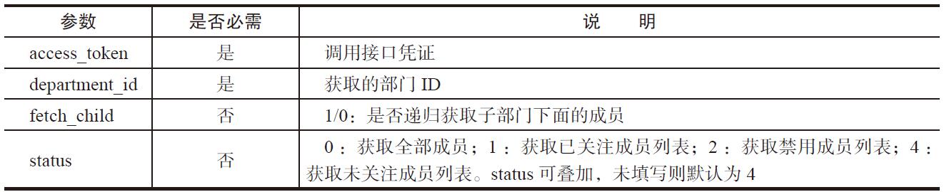 https:// qyapi.weixin.qq.com/cgi-bin/user/list?access_token=ACCESS_TOKEN&department_id=DEPARTMENT_ID&fetch_child=FETCH_CHILD&status=STATUS