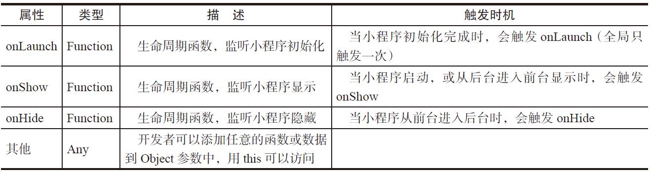 App({ onLaunch: function { // Do something initial when launch. }, onShow: function { // Do something when show. }, onHide: function { // Do something when hide. }, globalData: 'I am global data' })