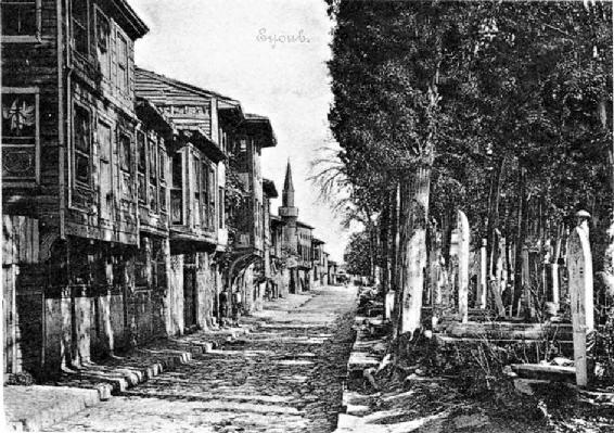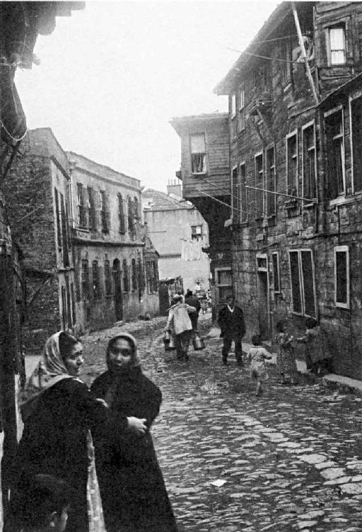 离开旅馆(位于今日的贝尤鲁),经过加拉塔漫步到金角湾海岸,过加拉塔桥(建于1853年,他称之为“船之桥”),戈蒂耶与他的法文导游继续前往西北方的翁卡帕尼(Unkapani),一会儿,他们便“栽入迷宫也似的土耳其巷弄”。他们越走越觉得孤单,跟在身后咆哮的狗也越来越多。每回读到未经粉刷、颜色变黑、东倒西歪的木造房屋,残破的喷泉,年久失修、屋顶塌陷的陵墓以及他们一路上看见的事物,我便诧异一百年后搭我父亲的车看见的这些地方,除了卵石路面之外丝毫未变。戈蒂耶之所以留意到破旧黝黑的房屋、石墙、空巷以及墓园不可缺少的柏树,是因为他和我一样,觉得它们很美。当我自己开始在同样贫困、尚未西化的居住区(可惜的是,大火和水泥将抹灭它们的痕迹)到处漫游时,我和他一样,在饱览景致的同时,仍有着“往来于巷弄,广场间”的强烈冲动。宣礼对他而言,就像之后对我而言,似乎是在呼唤“沉默孤独地倾塌于此的又哑又瞎又聋的房屋”。他思索时光的流逝,眼见七零八落走过去的人与动物——某个老妇人,消失在石子间的蜥蜴,朝残破的喷泉池子扔石头的两三个男童,他们使他想起两年前与福楼拜共游伊斯坦布尔的德康所画的一幅水彩画。他饿了,发现此区的商店与餐厅提供甚少,于是大口吃着树上的桑葚。桑树为小街凭添色彩,至今依然,尽管街旁已成水泥建筑。他逐渐习惯了希腊区的氛围,亦即所谓“伊斯坦布尔贫民窟”的萨玛提亚和巴拉特(Balat)。巴拉特的房屋墙面满是裂缝,街道脏而泥泞,但费内尔的希腊区则维护得较好。每当看见拜占庭城墙遗迹,或大水道桥的残余,他便觉得木头的无常胜过砖石的耐久。