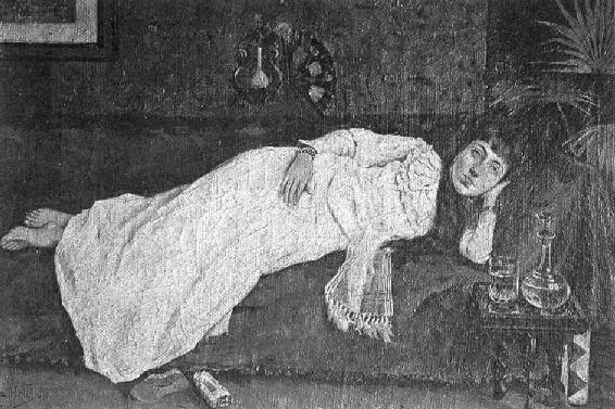 这是哈里尔·帕沙(Halil Pasha)的《斜躺的女子》。去希尔顿大厅过后的第一次见面,我们绕过博物馆其他部分,直奔这幅画:画中模特儿是个年轻女子,我第一次观画时惊奇地注意到,她踢掉鞋子,躺在一张蓝色沙发上,悲伤地凝视着画家(她的丈夫? ),一只手臂枕着头,就像我的模特儿多次做过的一样。不仅是这种出奇的相似性驱使我来看这幅画——在我们最初几次来到挂这幅画的小展览室这段期间,她看着我们接吻。每当听见某个起疑心的老警卫踩着镶木地板咯吱咯吱走来,我们便停止接吻,坐直身子,认真地讨论起她,因此我们对这幅画的每个细节了若指掌。除此之外,我们还加入了在《百科全书》中找到的有关哈里尔·帕沙的一切。