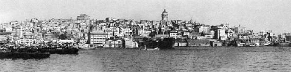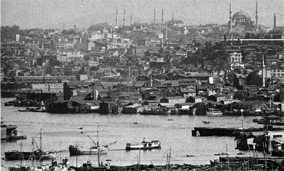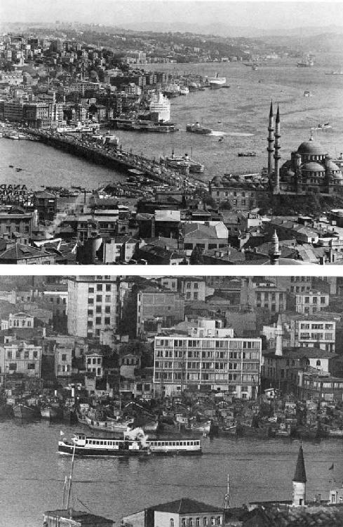 透过甲板后方抖动的窗户,我望着金角湾的码头缓缓流过,被古伊斯坦布尔时代的木造房屋覆盖的山丘,以及种满柏树的墓园;胡同、黑色的山丘、船坞、生锈的船壳;绵延不绝的小工厂、商店、烟囱、烟草仓库;坍塌的拜占庭教堂;雄立于破街窄巷上方的奥斯曼清真寺;翟芮克的“全能之主”教堂;席巴里的大烟草仓库;甚至远方法蒂赫清真寺的影子——透过模糊、抖动的船窗,这幅正午的场景犹如我在支离破碎的老电影中看见的伊斯坦布尔风光,像午夜一样黑暗。