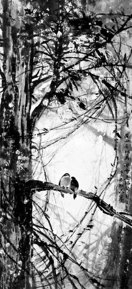 我这些幽暗的、迷惘的、凄凉的、缭乱的画无处发表,不能展览,它只是一种自我的慰藉,但它一直陪伴着我,成为那个时代我的一部分。因为它是艺术,再忧伤也是美的,我享受着它们。一次,天降大雪,半夜偏偏炉火灭了,却没有木柴把炉火重新点燃。我和妻子两人在冰窖一般的小屋里,紧紧拥在一起,互相给予生命必需的温暖,转天就画了一幅《北山双鸟图》并题一首小诗: