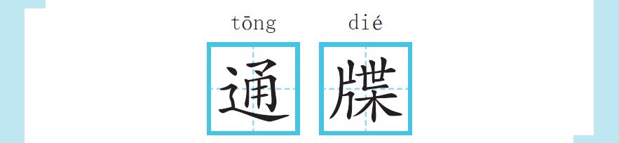 “牒”从片,葉(yè)声,本义是用来书写的简札。“片”的甲骨文字形很像劈开的木片,本义就是劈开树木。古人剖下木片和竹片当作书写材料,由此可以联想到“牒”是“片”部。和“牒”字形相近的常用字有谍、喋、蝶、碟,书写时不可混淆。“谍”从言,本义为间谍;“喋”从口,形容话多,如“喋喋不休”;“蝶”从虫,指蝴蝶;“碟”从石,是盛食物的小盘子。
