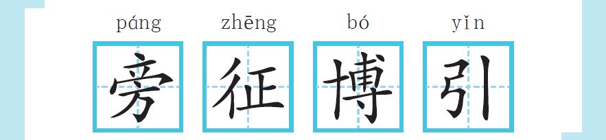 《说文解字》把“旁”字说解为“溥也”,本义就是大、广。“旁征博引”的“旁”用的就是这个义项。清代王韬《淞隐漫录·九·红芸别墅》中有“而女博引旁征,滔滔不竭”的句子。“旁征博引”指的是广泛、大量地引用材料作为依据或例证,也作“广征博引”“博引旁征”。