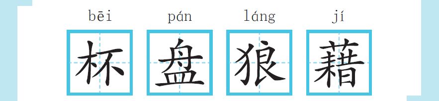 杯盘等放得乱七八糟。形容宴饮后桌上凌乱的样子。