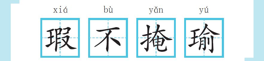 瑕:玉上的斑点,比喻缺点;掩:遮盖;瑜:美玉的光泽,比喻优点。斑点无法掩饰玉的光泽,比喻缺点掩盖不了优点。