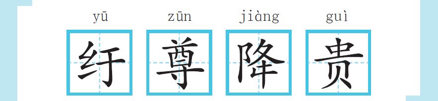 “纡”与“降”在成语“纡尊降贵”中意思相近,均有降低身份的意思。“纡”本义是弯曲,《周礼·考工记·矢人》“中弱则纡,中强则扬”中的“纡”便是弯曲、曲折之义。“纡尊”,弯曲自己的尊贵,一个人身份尊贵本可让人仰视,他却放下身段,弯曲自己高傲的脊梁,采用较为谦卑的姿态。“降贵”,降低自己的尊贵。