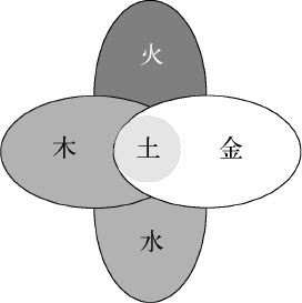 在五行中,最难理解的是“土”。这个“土”有两方面的概念,一般人理解认为土是和金木水火平行的一个元素。事实上,土除了和金木水火有一个平行的概念外,另外还有一个概念,就是太极“一”的概念。本书后面会提到的墓和库的术语就是这个概念。土分为辰土(水墓、库)、戌土(火墓、库)、丑土(金墓、库)、未库(木墓、库)。当土作为墓和库来看的时候,它和金木水火是整体和个别的关系。比如说:一个大拇指,它就是土。当你把它当土看的时候,它和其他手指的关系是平行关系,当你把它当成墓库来看的时候,它本身含有两个指节,可以和任何一个手指构成一个太极,共有五个指节。这个墓库的土可以和其他的手指构成四个不同的金木水火太极圆。因此,在五行图的画法中,有两种不同的画法。一种是平行关系,一种是土在当中的关系。如图: