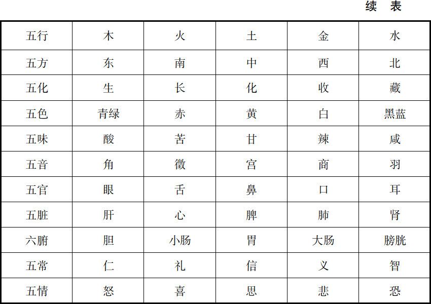 “五行对应表”是坊间广泛流传的便于初学者记忆的汇总表。笔者认为,此表仅可作为记忆的参考。如:“五色”中木代表青绿,而实际只有木与木发生关系时才是青绿色,木与火发生关系时,则是红、绿相作用后的颜色。