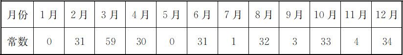 从1900年开始,每隔四年(闰年)有一个常数,在两个闰年之间的每一年加5,到第四年(即第2个闰年)加6;超60减60后的余数再按前面方法计算。具体数值见下表: