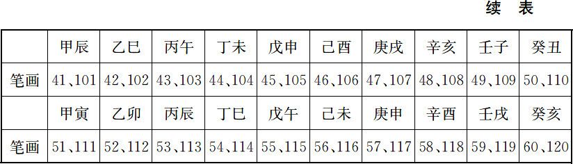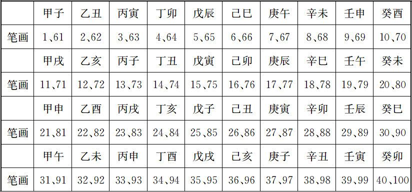 姓名笔画总数的五行转换以六十甲子为依据,如下图: