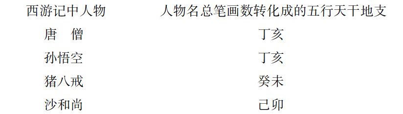 猪八戒的名字癸未,常常反对唐僧和悟空,特别是悟空。因为癸要灭丁火,未要克壬水;对于唐僧,表面反对,但心里还是有些服气的,因为甲己有合局。当猪八戒反对悟空时,沙和尚是会劝阻的。
