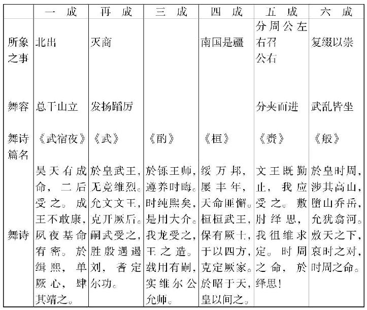 其二曰《武》,或曰《大武》。《左传》宣十二年记其卒章、三章、六章中语,今在《武》《赉》《桓》三章中,他章无可考。据《左传》宣十二年语,《武》乃克殷后作,所纪念者为武成之义,故庄王于此推论出《武》之七德来——禁暴、戢兵、保大、定功、安民、和众、丰财。《武》为儒者所称道,在儒家的礼乐及政治的理论中据甚高的地位。王静安君据《乐记》所记之舞容,从《毛诗》之次叙,把《大武》六章作成一表,其说实无证据,现在先录其表如下: