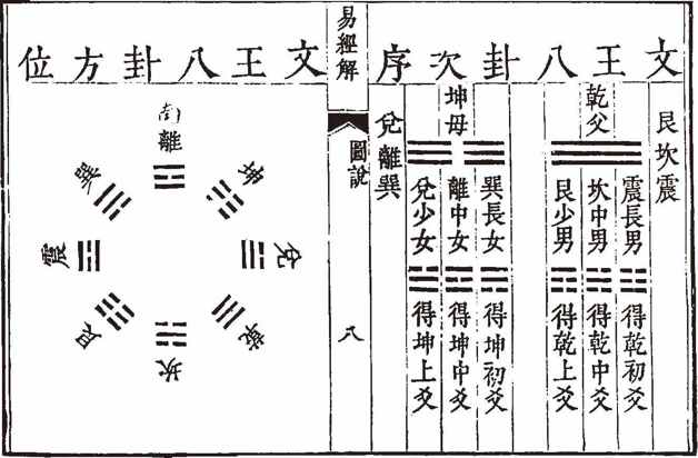这是文王八卦的次序与方位图,是影印自宋代朱长文的《易经解》,湖北省图书馆藏明崇祯四年(公元1631年)刻本。左页图是八卦,八卦可以用来表示方向。右页图就是把八卦当成一个家庭,乾卦象征老爸,坤卦象征老妈,震、坎、艮是这家里的三个男孩,分别是大哥、二哥、小弟,巽、离、兑是这家的三个女孩,分别是大姐、二姐、小妹。八口人构成了一个大家庭。