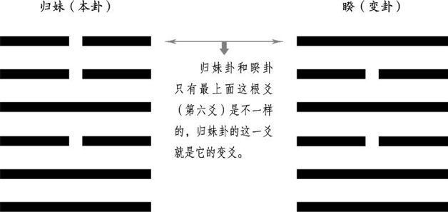 这是两个卦,我们可以把“归妹”看做本卦,把“睽”看做变卦。仔细看看,归妹卦和睽卦长得很像,只有最上面那根爻(也就是第六爻)不一样。睽卦最上面的是阳爻,归妹卦最上面的是阴爻,这根爻我们把它看做变爻,那么,根据前边讲的规矩,“归妹之睽”需要用归妹卦第六爻的爻辞来判断吉凶。