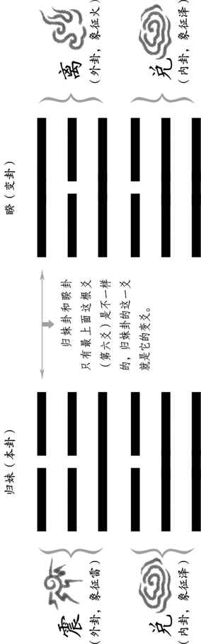 这种看卦方法我在前边已经讲过了。归妹卦是属于六十四卦系统里的,从下到上一共六根爻,这六根爻的下面三爻构成了一个八卦系统里的兑卦,上面三根爻构成了一个八卦系统里的震卦。《易经》里写成:“归妹,兑下震上。”在下面的兑卦叫做“内卦”,在上面的震卦叫做“外卦”。其他的卦也都是这个规矩,可以看成“内卦”和“外卦”两个部分。