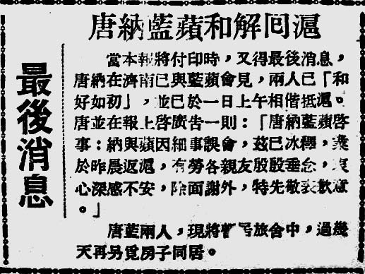 7月4日《娱乐周报》:《六和塔结婚还不到三个月唐纳在济南自杀》、《唐纳蓝苹和解回沪》;