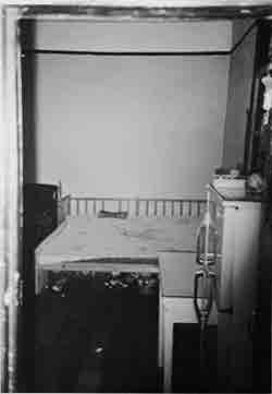 秦桂贞带着我们上了二楼,来到蓝苹所住的亭子间。这是一个不多见的直角三角形的房间。三角形的顶端是一个小小的卫生间,装了一个坐式抽水马桶。房间大约十来个平方米而已。有一扇窗。秦桂贞回忆说,当时,窗下放一张书桌,桌上有台灯。三角形的直角处,放一张双人床。床下放着皮箱。另外,还有两把椅子。这便是蓝苹住处的全部陈设。由于人们不喜欢住这三角形的房子,所以租金最廉。也正因为这样,底楼的那间三角房子,作了灶间,而三楼的三角形房间,成了佣人秦桂贞的住房──她与蓝苹的房间只隔着一层楼板。
