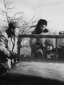 夫妻二人的穿着都很平常。妻子的一身像睡衣裤一样宽大的劳动布服装绑在她那样纤细的腰身上,使她的身段愈显苗条;丈夫穿着一件粗糙的、带补丁的土布上衣,短得不能遮住小腿的裤子。我被带到了“客厅”,这是一间用砖块铺地、白灰刷墙、摆有几件结实但很粗糙家具的窑洞。时间已到了晚上,洞内仅有的几点光线来自一支被固定在一只倒置茶杯上的蜡烛,几支点燃的烟头上。谈话期间总有几个儿童跑进跑出。这些儿童站下来盯了我几秒钟,然后剥了一块糖放在嘴里又跑出去玩了。毛泽东好像根本不在乎他们的存在。