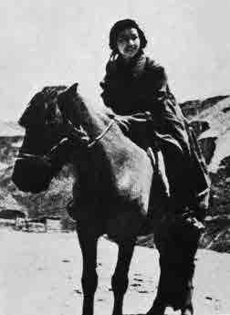 在我们第二次过河之后,我们被一位女骑手风驰电掣般地追了上来。快要追上我们时她一下停住了,勒紧缰绳,用一种带有野味的姿势快活地欢迎我们,她就是毛泽东夫人。像成千上万年轻的中国人一样,几年前她来到了延安这个特殊的地区,并在政治大学学习。在此之前她是上海的一位著名女演员。现在,她已是一名年轻的共产党员。她为伟大光荣的中国共产党所从事的工作是做毛主席的个人秘书。她为他安排活动日程、记录演讲内容、抄写文稿并照顾其他各种各样的杂务。现在她是刚刚从毛主席派她去的一个遥远的地方回来,意气风发地坐在她那矫健小巧、神气十足、不停腾跃嘶咬的马上,两条辫子用缎带绑住盘在脑后。她穿一件缴获的日军军官大衣,光脚穿着一双木底草鞋。