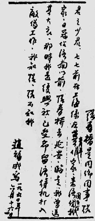 1937年秋天,日寇侵入济南前,我为秦启荣转过一封信给君弼。信上写的什么我不知道。是赵君弼来我家时,我把这封信交给他的。[125]