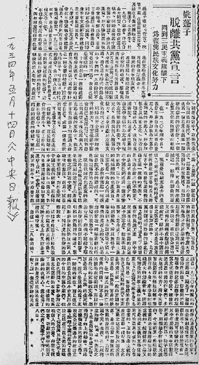 姚蓬子顷发《宣言》,脱离共党,兹照录宣言原文,及姚在共党经历如次。