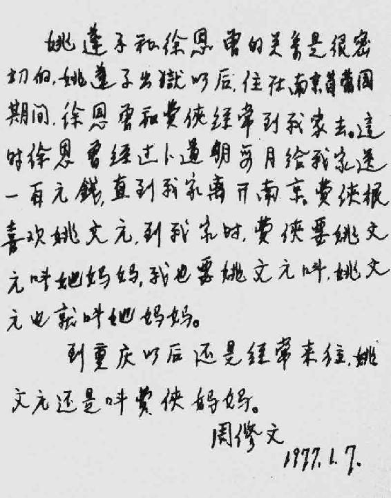 解放后,我因为在上海市监狱关押多年,所以当“文革”开始的时候,对外面的情况不了解。记得,起初有人来外调,要我写关于姚蓬子的材料,我也就写了[140]。