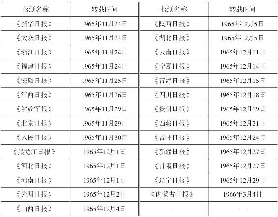 从以上各报转载的时间看:一、最先转载的是华东各省报,不言而喻,当时华东各省受中共中央华东局领导,最先知道姚文元文章发表的“通天背景”。二、其他各省报则都是在中共中央机关报《人民日报》转载姚文之后,才开始转载的。各省报转载姚文时,无一例外地同时转载了《人民日报》的编者按。